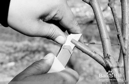 用同样的方法选择玉兰花接穗上一个合适的贴合嫁接点,用嫁接刀轻轻剖开皮层,露出形成层。
