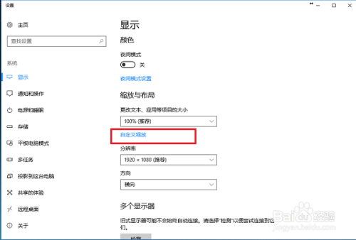 第二步进去显示界面之后,点击缩放与布局下面的“自定义缩放”,如下图所示: