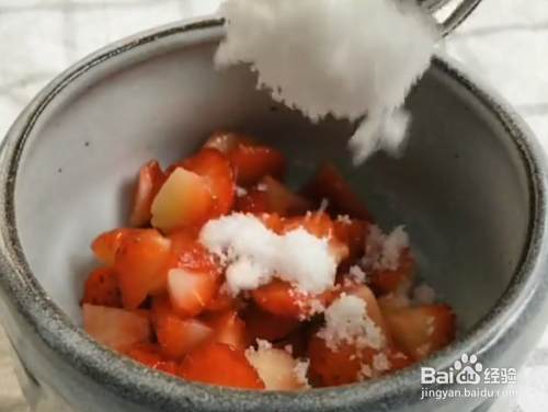 准备适量草莓切块,加适量细砂糖,稍微拌匀备用。