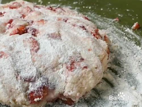 加入草莓,迅速混合均匀,整合成2厘米厚的面团。模具上也沾少许面粉,压出一个个圆形。