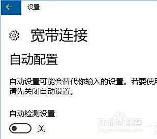 4、打开 宽带连接高级设置界面,我们移动到下面 自动配置 (自动设置可能会替代你输入的设置。若要使用你手动输入的设置,请先关闭自动设置)下方的 【自动检测】 开关打开即可。