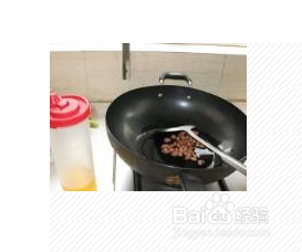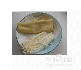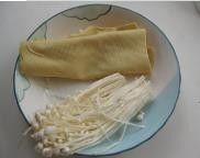 6.油炒豆瓣酱,放入火锅底料一起炒,先放入一半的蒜末,炒香菇根、金针菇、豆芽、海带、千张丝,放入适量鲜贝露,倒入土豆粉、丸子,煮一会后放入盐、鸡精、胡椒粉调味