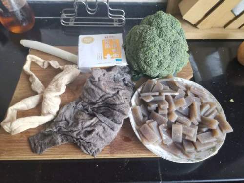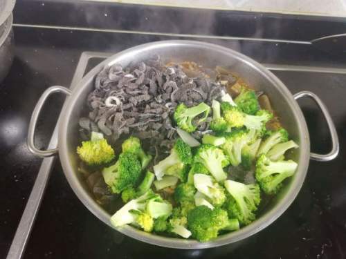 9十分钟后开盖,再加入毛肚和西兰花翻炒。