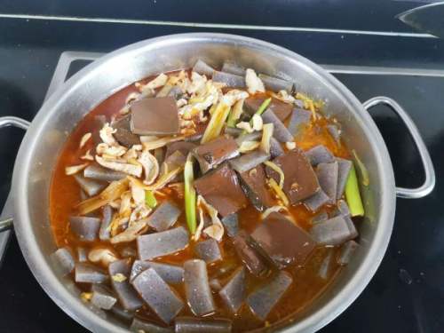 8加入焯好水的磨芋、鸭血后,撒一勺盐,两勺生抽,一勺老抽加适量清水盖上锅盖焖煮十分钟。