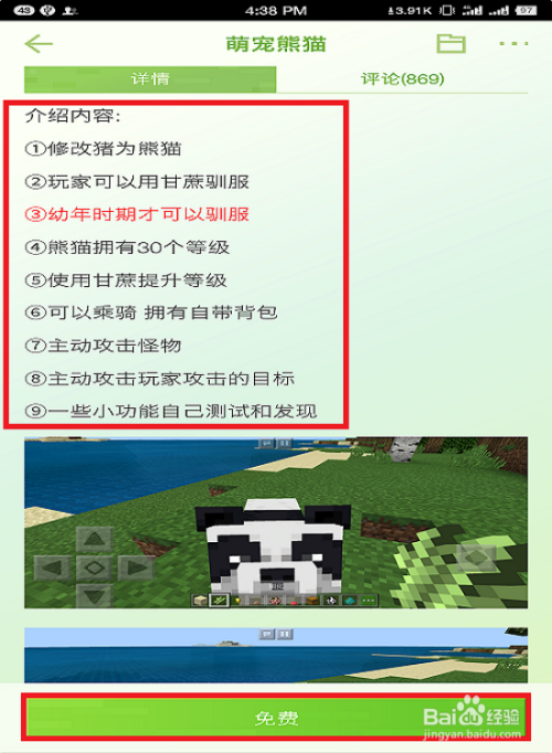 我们在这个界面可以查看到关于这个模组的介绍和使用方法,这个模组是把游戏中的【猪】修改成了【熊猫】,然后使用【甘蔗】来进行驯化,并且只有幼年时期可以驯化哦,需要特别注意这一点!