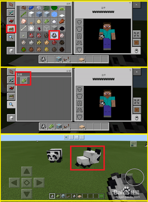 然后,我们进入到游戏,打开背包,拿出“熊猫蛋”和“甘蔗”。我们使用“熊猫蛋”来孵化出熊猫,注意一定要是小熊猫哦!