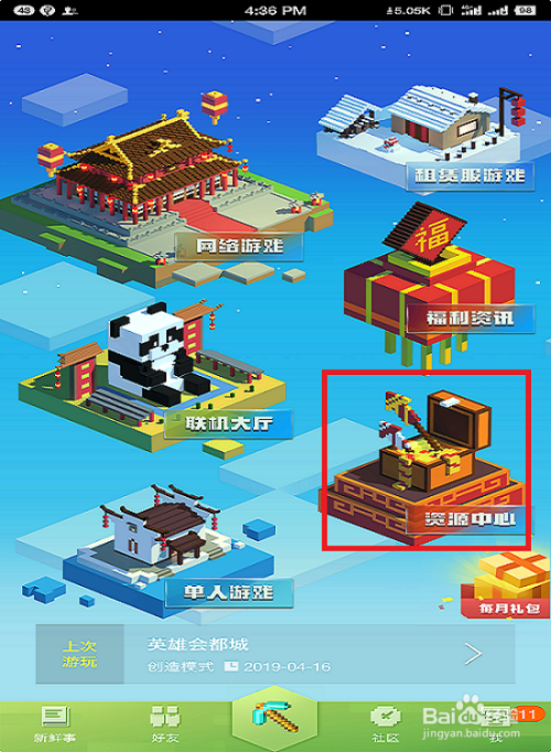 首先,我们进入到我的世界游戏主界面,在这里我们可以看到一个空岛上写着【资源中心】,我们点击它。