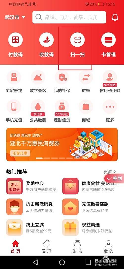 第二步进去云闪付首页之后,点击扫一扫,如下图所示:
