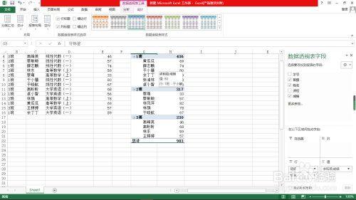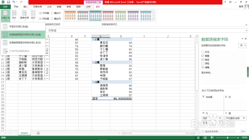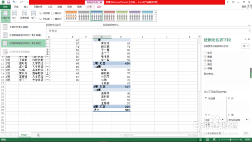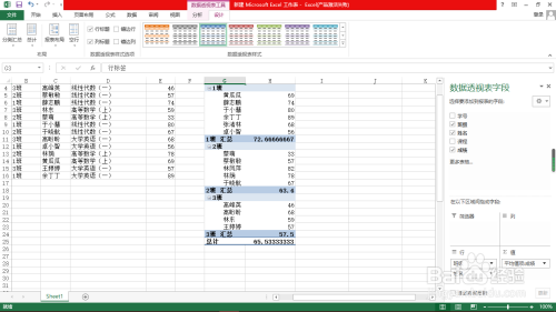 会发现此时的数据无法使用布局调整工具,点选了没有反应,原因之一就是此时的汇总数据还不能达到汇总分类这一个要求。此时把(班级)也拉到行列表(能够进行布局调整——分类汇总设置的大前提就是行或者列能够有两个或者两个以上有效字段,咦达到分类的标准)。