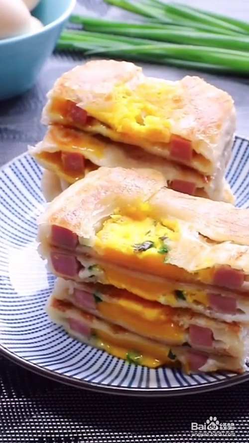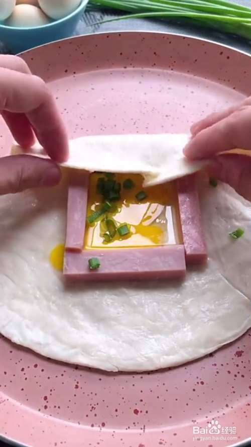 再放入火腿肠、鸡蛋、葱花;把手抓饼折起来。