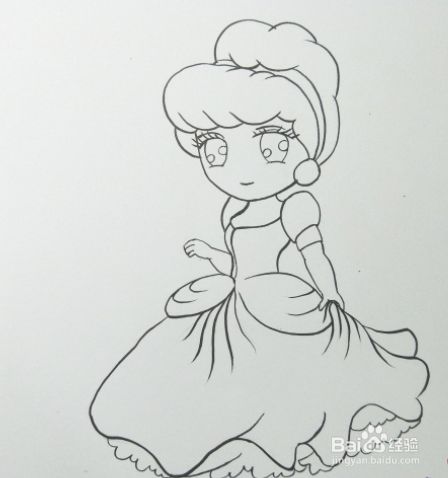 继续画出灰姑娘的裙子,裙尾要画出花纹,画出褶皱的线条。