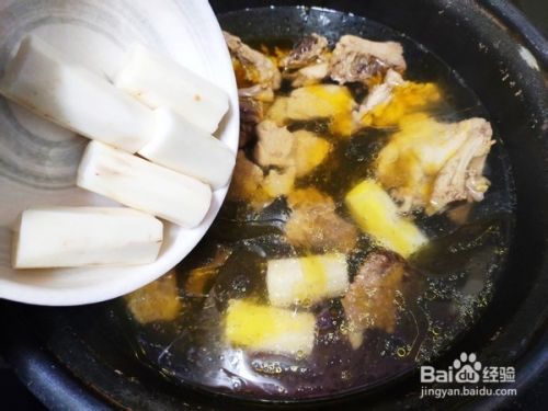 待鸡汤熬制2.5小时后,倒入山药,继续煮15分钟。