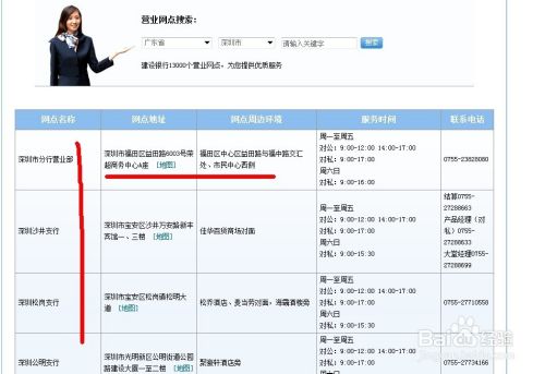 如下图所示就是你查询到的深圳网点信息,包括支行及网点地址、上班时间、电话号码。