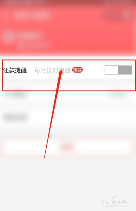 在【信用卡管理】中,点击【还款提醒】右侧的【开关】按钮,置为蓝色;