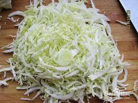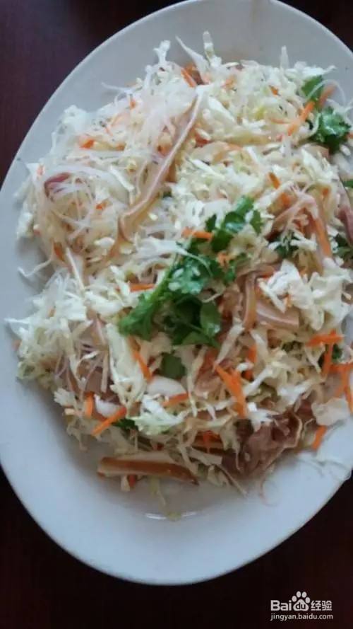 盆内放入猪耳朵丝、白菜丝,倒入调好的蒜泥,香油搅拌均匀盛在盘中摆盘。