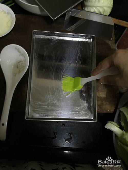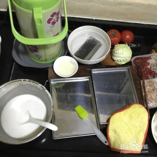 准备工具。一套肠粉工具包括两个盘,一个油刷,两个挂片。自己准备一个防烫手套,蒸要拿出来盘子很烫。一点色拉油。一碗凉水,是刮皮前沾水防粘连的。