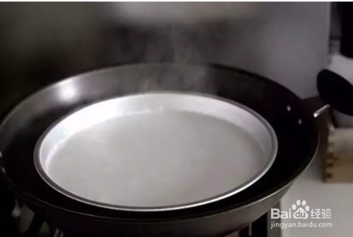 在煮锅里倒1/3深的水煮沸,关火,给铝制的平底盘刷一层油,倒上少量的面粉混合物,摊匀,使液体盖住整个盘底;