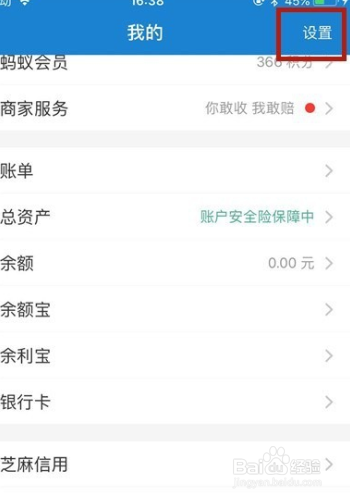 进入手机支付宝界面后,在我的界面,点击进入设置,如下图所示。