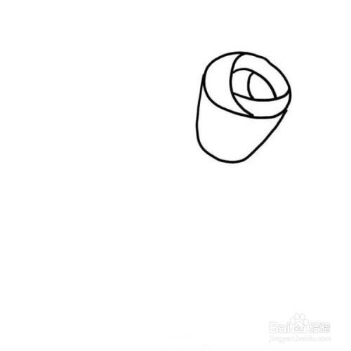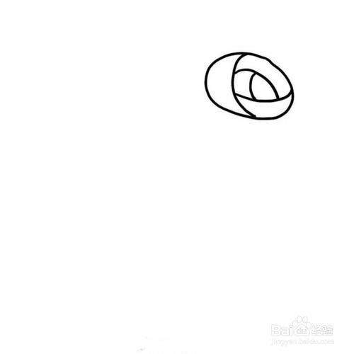 第二步在刚刚画好的椭圆形中,画上花瓣(这样的花瓣是没有盛开的样子)。在中间画出三角形的形状,但是线条要圆滑一点,眼神到椭圆形的边缘。画两个一大一小的三角形,大的三角形包裹住小的三角形哦。