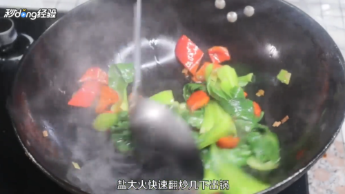 放入葱花、辣椒、酱油、青菜、盐翻炒,即可出锅。