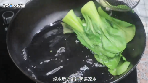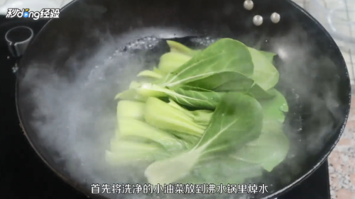 将洗净的小油菜,放入沸水锅中焯水,时间根据油菜的老嫩定。