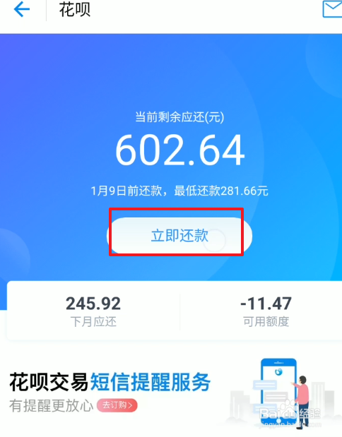 点击进入之后呢,我们可以查看当月需要还的花呗额度,这里我们点击立即还款。