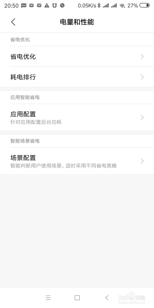 向下滑动,会看到一个电池和性能的栏。在电池和性能里有一个应用配置的栏,这个栏是可以设置智能省电的设置,点击进去会等待比较长的一段时间。