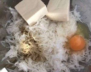 加入2块嫩豆腐,1个鸡蛋,少许盐,1勺五香粉,用手把豆腐揉碎,所有材料混合搅拌