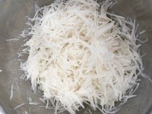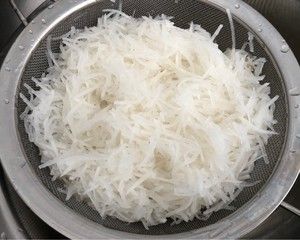 锅内加入清水,煮沸,加入挤去水份的白萝卜丝,焯1分钟