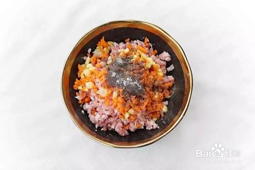 猪肉馅中加入盐、蚝油、胡椒粉和芝麻油,以及胡萝卜丁、玉米粒