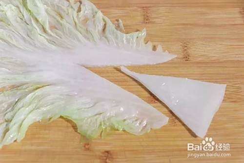 水中加入一点盐,烧开后把白菜放入锅内烫一下,时间不宜过久,变软后即可捞出;烫好的白菜放在菜板上,如图,在根部切去一个三角形