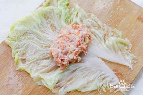 用勺子挖一大勺肉馅放置于白菜中间的位置,然后慢慢向上卷,两边多出的菜叶记得往里收一下