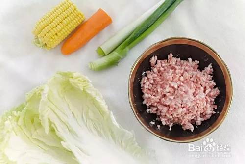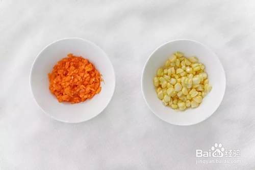 白菜洗净,胡萝卜去皮切成丁,剥下玉米粒备用