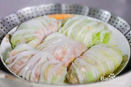 白菜卷都完成后把它们摆好放在盘中,锅内烧水,等水烧开后上锅蒸15-20分钟,蒸好的白菜肉卷静置放凉一些后控掉多余的汤汁,撒上葱花