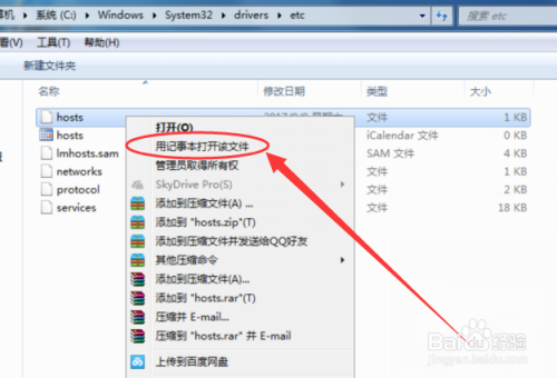 进入etc文件夹以后,我们就可以看到问价夹里面有个文件命为“hosts”的文件,然后点击右键选择“用记事本打开”。