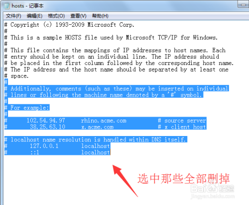 host文件用记事本打开以后,用鼠标选中“# Additionally……”的全部内容然后全部删除掉(如下图),删掉以后点击保存,然后重启itunes更新/恢复即可。