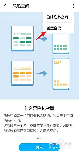 点击【重置密码】回答密保问题即可重置进入隐私空间的密码。