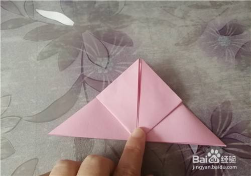 我们把下面的两个角分别向上折,然后把彩纸翻到背面,把下面的角上折,一定要过线。