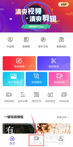 首先在手机上安装并打开软件,然后点击首页下方项目栏中的“视频工具”,进入视频工具页面。