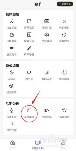 进入视频工具页面后,点击后期处理模块中的“视频压缩”功能,进入视频导入页面。