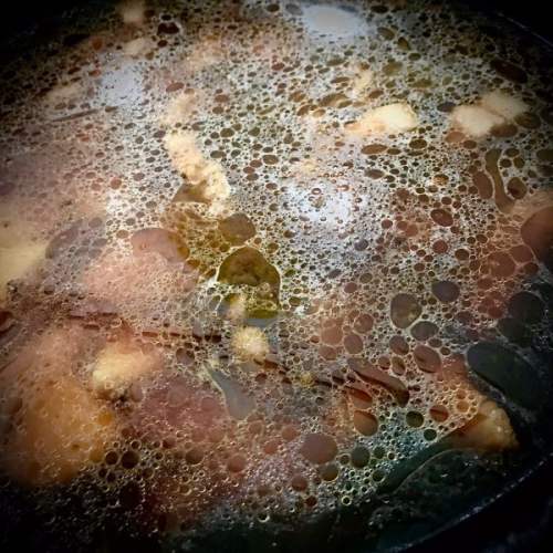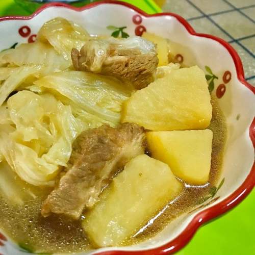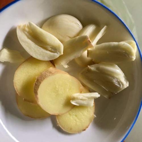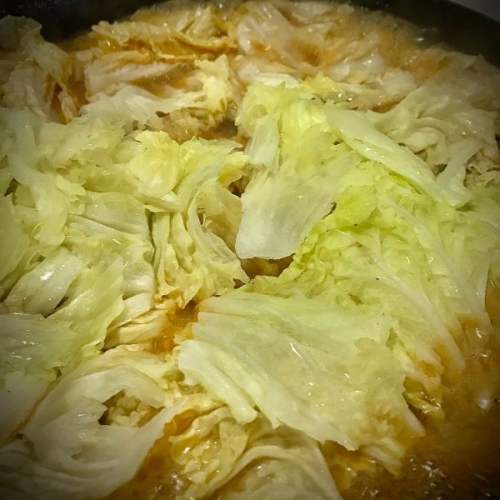 11待小火慢炖最后5分钟时,加入白菜和蒜瓣。最后出锅前加入适量的鸡精。