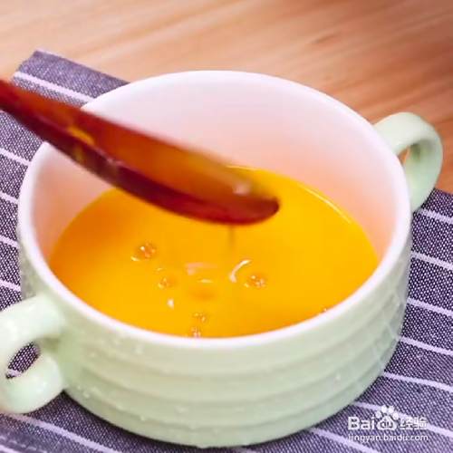 然后倒入南瓜泥。搅拌均匀,再加两勺白糖,搅拌至白糖融化。