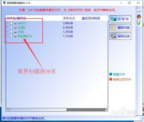 软件会很快将找出的资料,软件会将找出的分区列出来。
