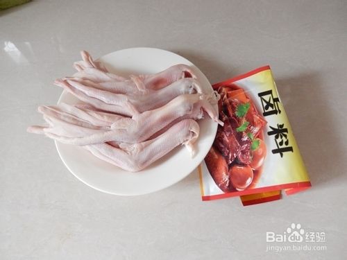 焯过水的鸭掌,同姜和葱,香料包一起入锅。