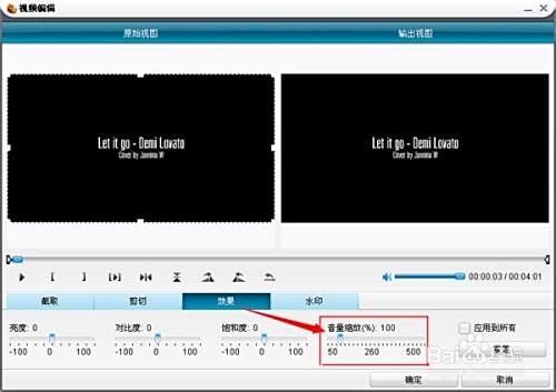 视频文件添加进来后,选中任务列表中的其中一个视频文件,然后可以看到上方的[视频编辑]按钮变亮了,点击其进入视频编辑面板,里面拥有截取、剪切、水印、效果、旋转等功能可以操作,点击[效果]功能所属,在其下方就有[音量缩放],操作很简单,拖拉上面的移动按钮即可。往左拉是缩小视频音量,往右拉是放大视频音量。