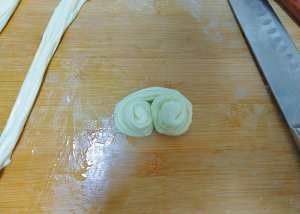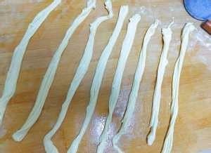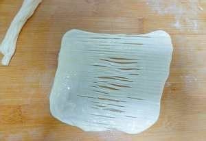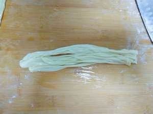 将其切成细丝。越细越好,每根细丝都刷足油,然后拉长成长条,拧一下放置一旁松弛,做好后然后取最开始的那条,两边分别向中间卷起