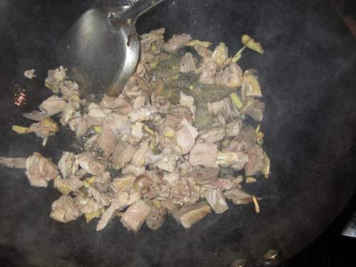 7放入鸭肉翻炒,加入适量的盐。