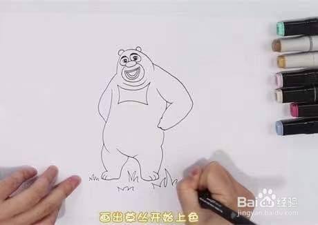 接着画出熊二的五官,嘴巴很大,并在地面上画上小草。