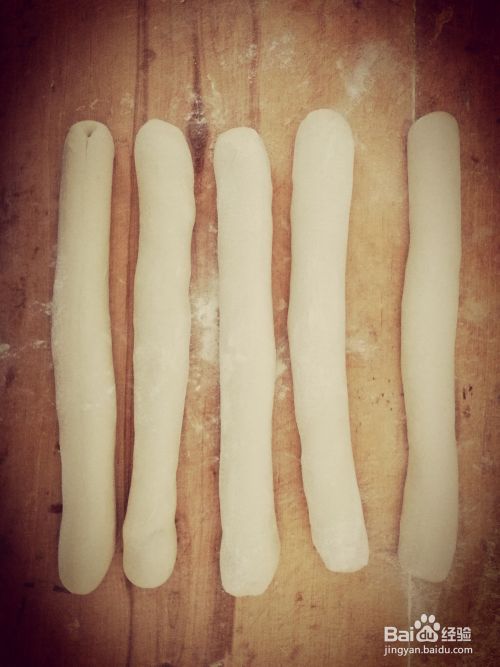 将五个面团揉搓成条状,注意是粗条状,如下图: