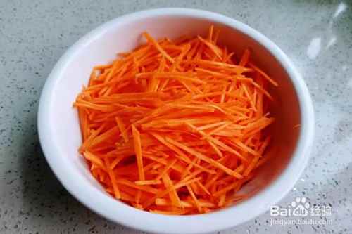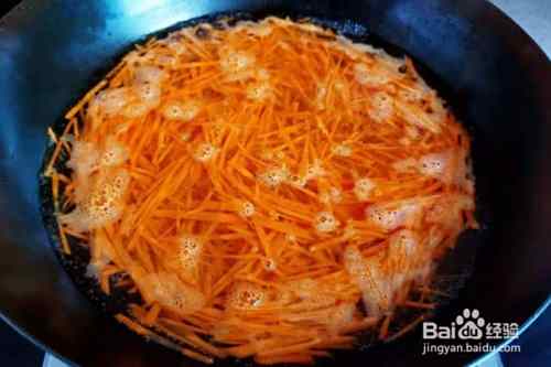 起锅,锅中加入水,将胡萝胳鉴卜丝倒入锅中,焯水大约1分钟左右,捞出